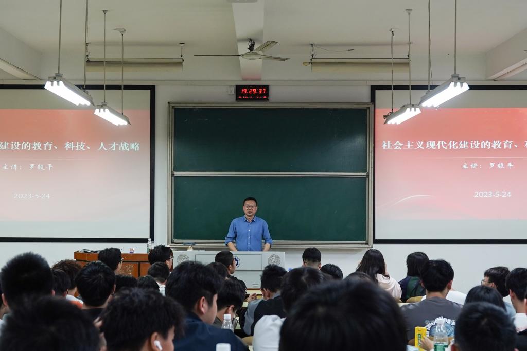 5月24日晚上,副校长罗毅平以《社会主义现代化建设的教育、科技、人才战略》为题,为材料成型2201-04班学生授课。罗毅平围绕如何理解新时代科教兴国战略的重大意义、怎样加快建设教育强国、怎样加快建设科技强国、怎样深入实施新时代人才强国战略四个方面的问题,为学生做了精彩而全面的阐释和解答。罗毅平指出,实现科教兴国战略、人才强国战略、创新驱动发展战略有效联动,必须坚持教育发展、科技创新、人才培养一体推进,形成良性循环;必须坚持原始创新、集成创新、开放创新一体设计,实现有效贯通;必须坚持创新链、产业链、人才链一体部署,推动深度融合。