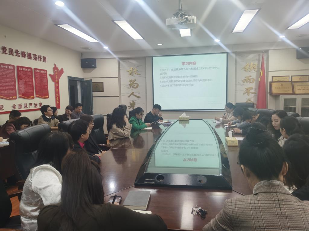 会议学习了《习近平在庆祝中华人民共和国成立75周年招待会上的讲话》《新时代高校教师职业行为十项准则》《新时代高校思想政治理论课教师行为规范和准则》和《2024年第二期师德师风警示录》等主要内容。