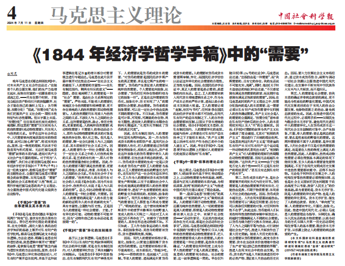 近日,副院长刘灵在《中国社会科学报》马克思主义理论专栏(2024年7月11日)发表文章《〈1844年经济学哲学手稿〉中的“需要”》。