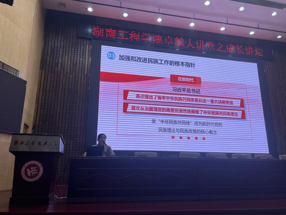 钟周丽嫄作题为《铸牢中华民族共同体意识》的讲座。她从铸牢中华民族共同体的战略意义、把握中华民族共同体意识的丰富内涵、铸牢中华民族共同体意识的实践路径等三个方面展开。她指出,铸牢中华民族共同体意识是维护各民族根本利益的必然要求,只有铸牢中华民族共同体意识,才能实现好、维护好、发展好各民族根本利益。在谈及中华民族共同体意识的丰富内涵时,她从增进“五个认同”、根植“四个与共”、树立“四个共同”、把握“四对关系”入手,引导学生把握中华民族共同体意识的丰富内涵。最后,她提出,要在教育引导、文化交流、经济发展和社会治理等方面下功夫,不断巩固和发展中华民族共同体意识。同时,她还鼓励同学们在日常生活中积极践行中华民族共同体意识,用自己的实际行动为构建中华民族命运共同体贡献力量。
