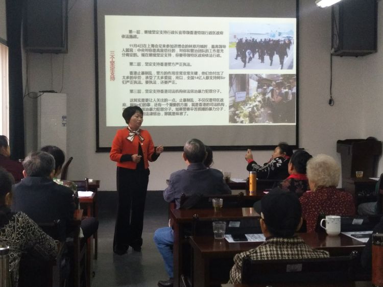 讲座完后,76岁的段纯英老太太分享了自己的听课感悟,她认为刘博士的讲课非常精彩,通俗易懂,让她深刻地感受到社会主义制度的优越性以及中国共产党的先进性。她还劲头十足地带领大家一起演唱了一曲《没有共产党就没有新中国》,表达了对伟大的中国共产党的感激之情。