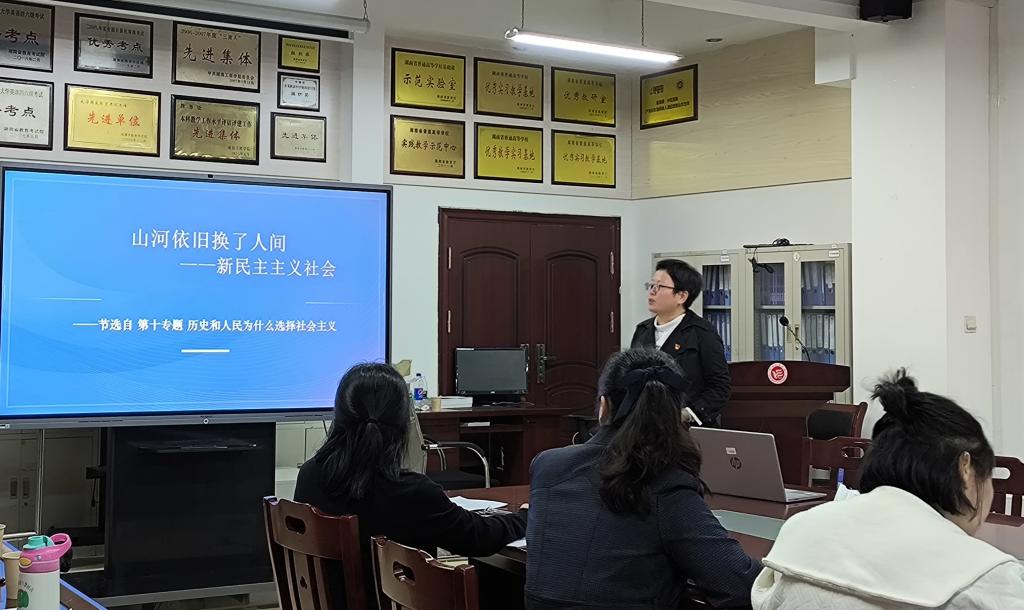 纲要教研室田小玲老师以《山河依旧 换了人间——新民主主义社会》为题进行了45分钟的党史学习教育主题课堂教学展示,从历史与现实等多方面深刻剖析了新中国为什么需要且为什么只能经过新民主主义社会过渡到社会主义社会,并从政治、经济、文化等多角度阐明了新民主主义社会形态的具体内涵。