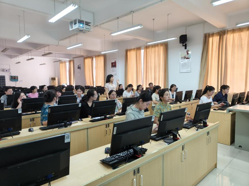 教师齐聚E312机房,参加AI课程建设与应用培训。培训会由副院长田小玲主持。
