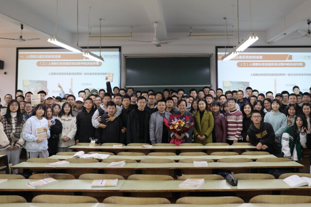 班子成员、原理教研室部分教师手捧鲜花来到教室中央,将鲜花献给黄顺年,向他圆满的职业生涯表示祝贺。与此同时,同学们一拥而上,簇拥在他的身旁合影留念。